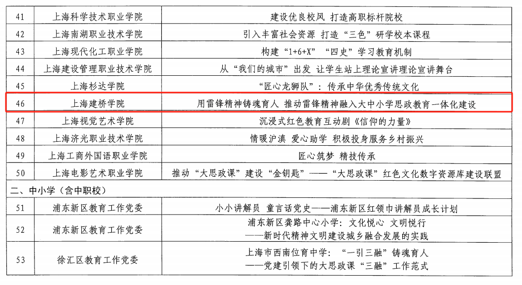 近日,中共上海市教育卫生工作委员会公布了入选“上海市教卫工作党委系统社会主义核心价值观建设典型案例”名单,我校报送的《用雷锋精神铸魂育人推动雷锋精神融入大中小学思政教育一体化建设》成功入选。
