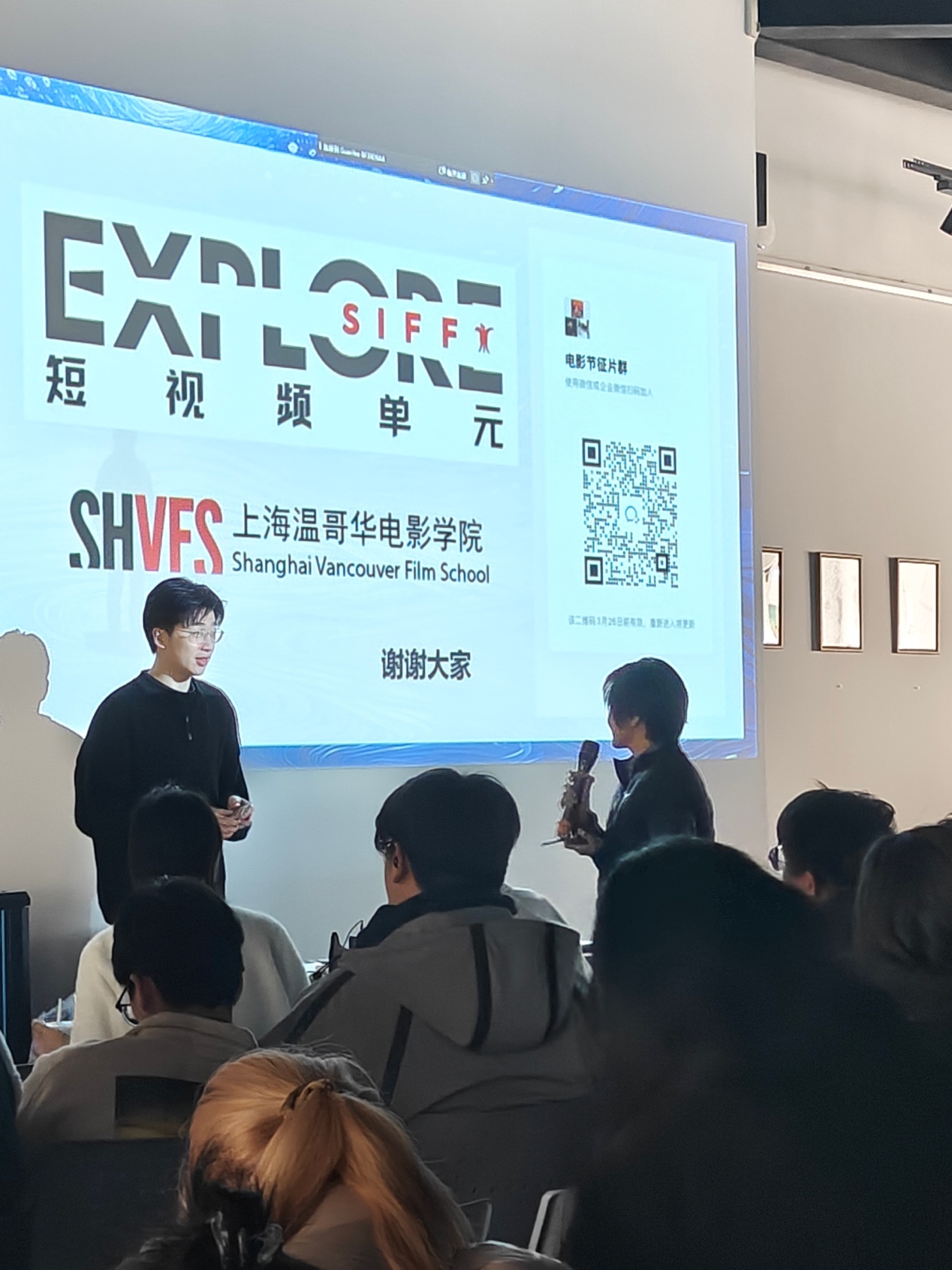宣讲会上,作为上海国际电影节短视频单元的独家教育支持单位,温影的老师对本届短视频单元的征片做了权威解读。不仅向同学们详细介绍了征片要求,包括参赛作品时长、作品类型、格式要求、拍摄形式、报名时间等。还通过一些获奖短片,向同学们讲授“如何做一个好的创意”。另外,还为想要参加比赛而没有系统学过视频制作的同学讲解了视频拍摄的基本方法,包括景别、构图、运动、蒙太奇、节奏、转场等。宣讲结束后,老师和同学们进行了热烈的交流和互动,同学们分享了自己对于往届获奖短片的解读,老师一一解答了同学们关于创意与制作方面的疑问,并送出了精心准备的小礼品。