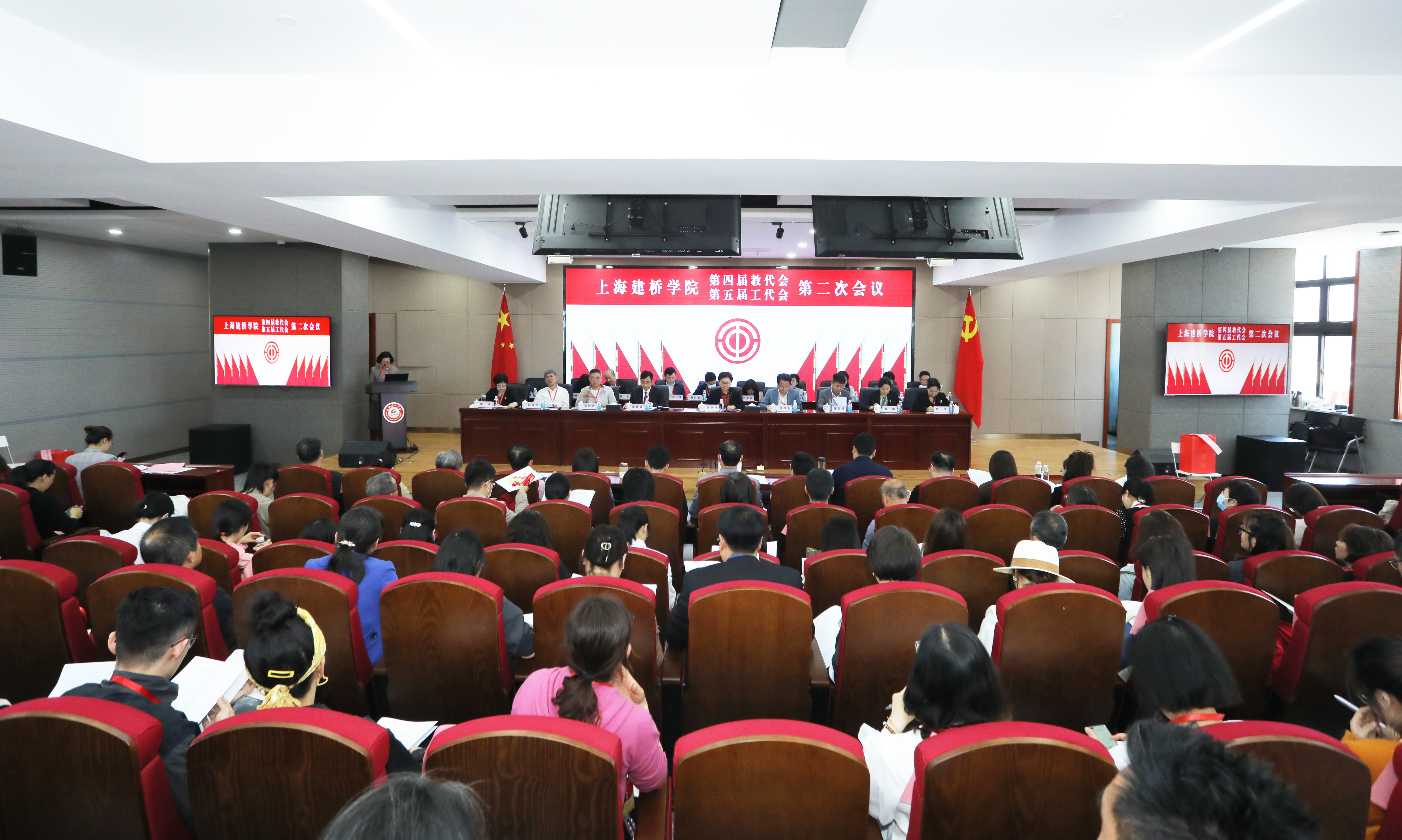 5月8日下午,在庄严的国歌声中,上海建桥学院第四届教职工代表大会暨第五届工会会员代表大会第二次会议(以下简称“双代会”)开幕。上海市教卫工作党委副书记、市教育工会主席张艳萍,上海建桥学院监事会监事长陈胜芳,我校双代会主席团成员、正式代表、列席代表等出席会议。校工会副主席潘秀玲主持会议。