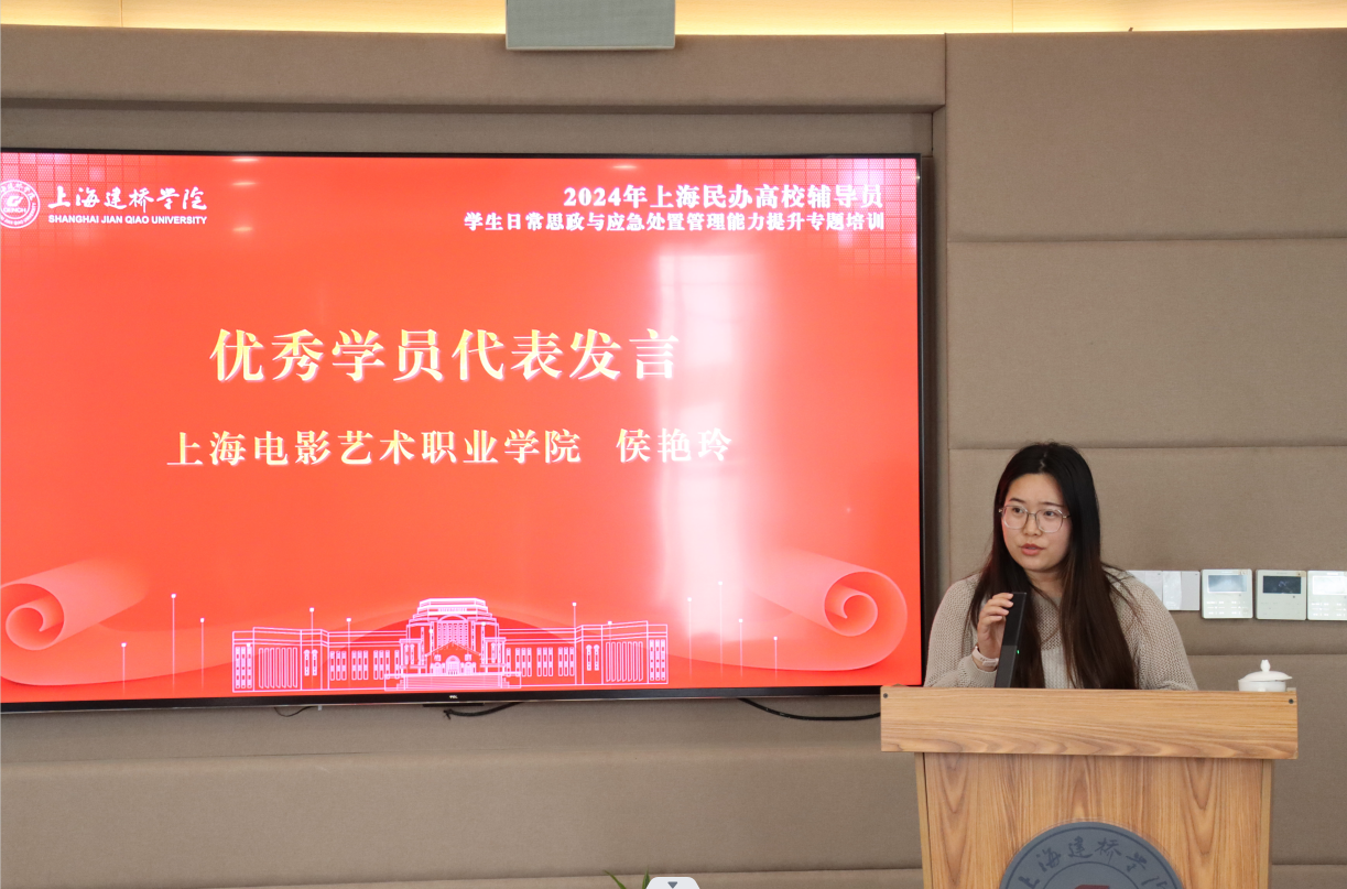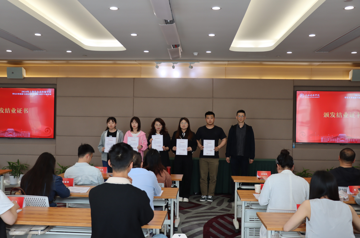 培训结束,进行结业仪式。学生处副处长王苇和处长助理刘雍鹤参加结业仪式。王苇为优秀学员颁发荣誉证书,刘雍鹤为学员颁发结业证书;优秀学员代表上海建桥学院敬建华、上海电影艺术职业职业学院候艳玲分享学习感悟。