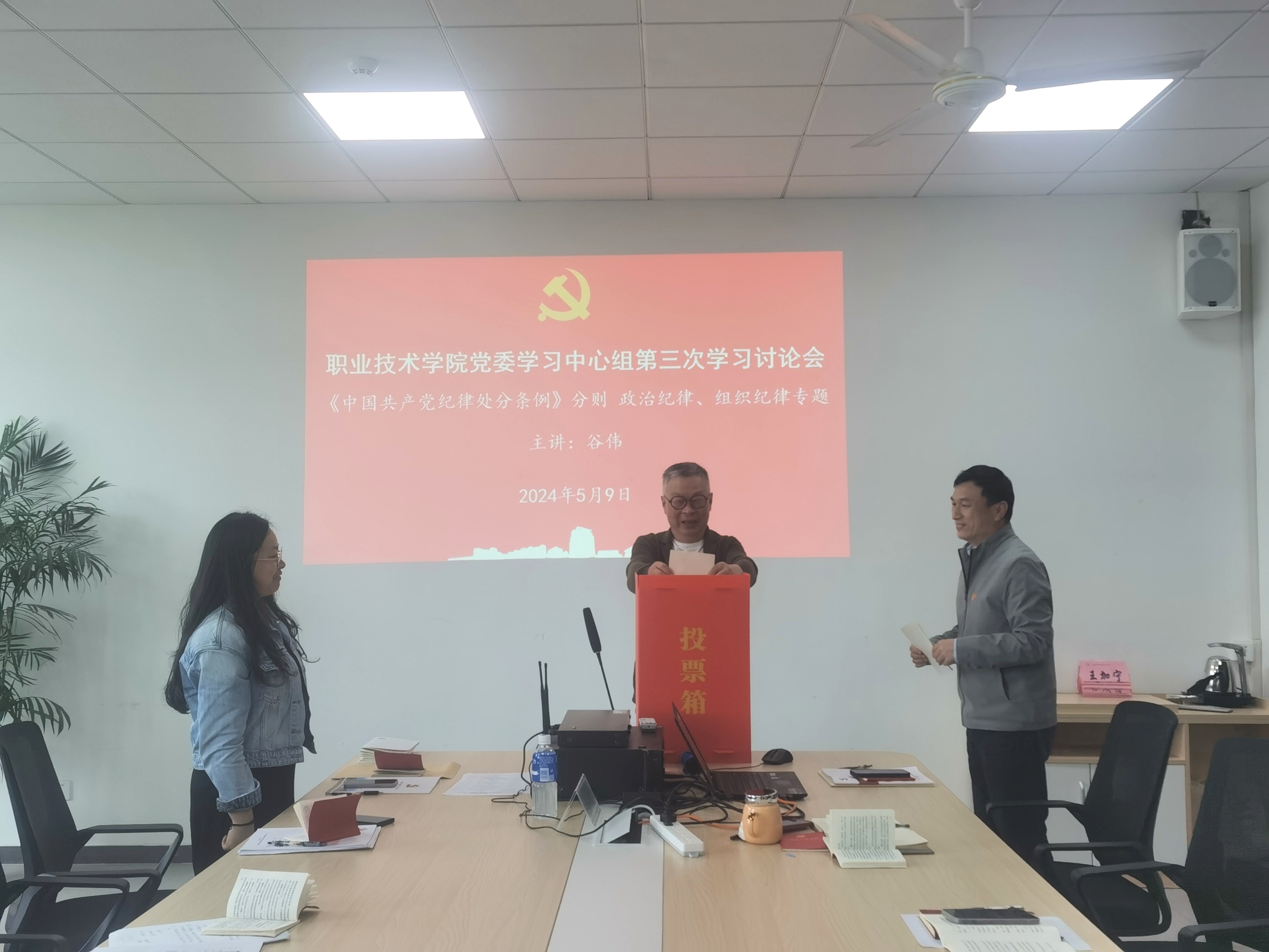 2024年5月8日下午,职业技术学院党委学习中心组第三次集体学习讨论,党委书记王加宁首先介绍了本次中心组学习的主要内容为《中国共产党纪律处分条例》中第六章和第七章的内容,包括“对违反政治纪律行为的处分“和”对违反组织纪律行为“相关内容。院长谷伟领读了该两章具体内容,并根据内容结合工作实际做了主要发言,与会成员结合工作实际作即兴交流发言,通过学习,中心组对党的政治纪律和组织纪律有了深层次的理解和体会。
