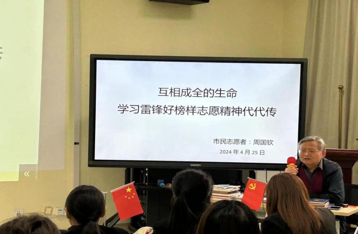 2024年4月25日,外国语学院2024上半年入党积极分子培训班第二次交流研讨于外国语学院129顺利开展。本次活动以“互相成全的生命:学习雷锋好榜样,志愿精神代代传”为主题,邀请到了中共四大纪念馆荣誉馆员、国旗故事宣讲队志愿者、上海市优秀志愿者周国钦与学员们一同交流讨论。