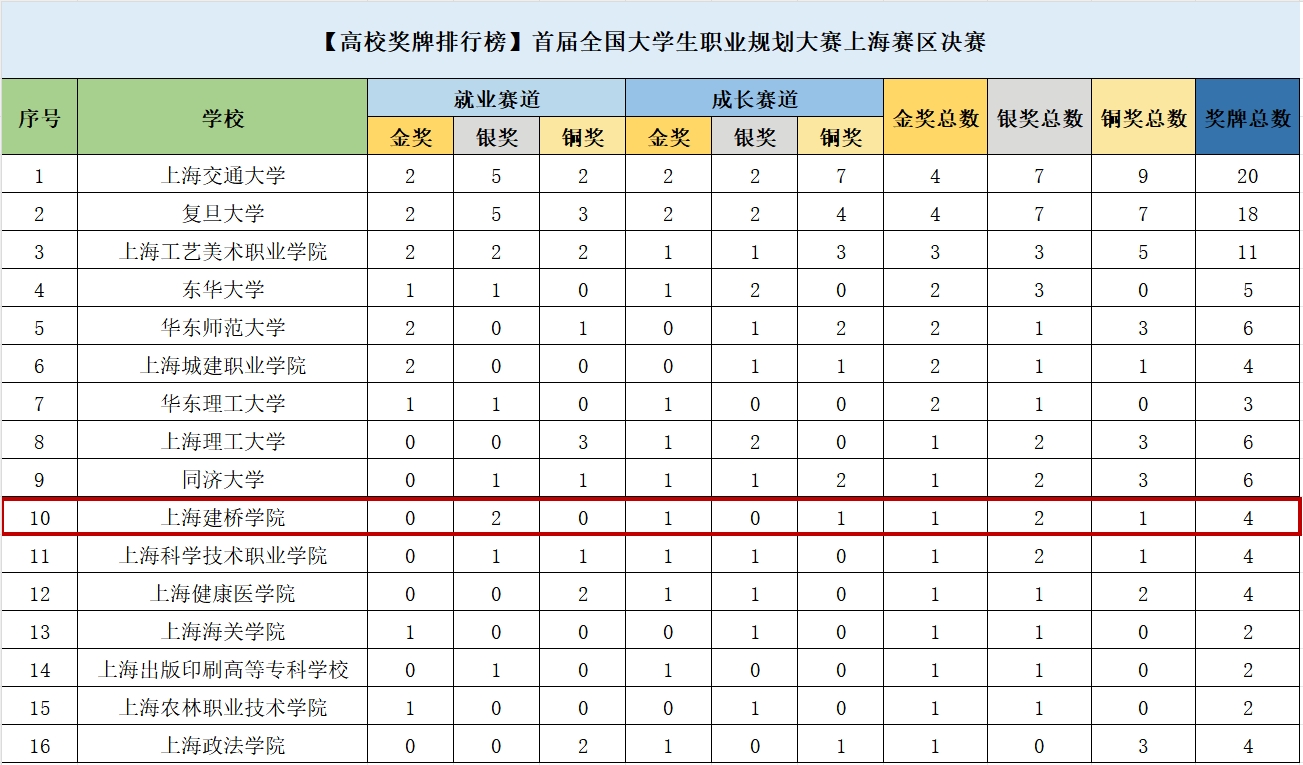 全国大学生职业规划大赛不仅是一个展示学生才华的舞台,更是一个启迪职业规划意识、为学子们未来职业生涯铺路的重要平台。大赛以“筑梦青春志在四方 规划启航职引未来”为主题,以立德树人、就业育人为主线,自2023年5月以来,学校开展了首届全国大学生职业规划大赛学生就业赛道、成长赛道和教师赛道的校内选拔赛。全校6987人报名参赛,经过学院比赛、学院推荐、校赛复赛、指导培训、校赛决赛等环节共选拔20人,组织选手培训2次、指导教师培训3次、修改参赛材料2轮、比赛预演1次,市赛选拔1次,共有17人进入上海市复赛,经过材料评审,4名同学分别进入上海市赛区就业赛道和职教赛道总决赛的高教组和职教组,学校就业办修改材料1次,邀请专家1对1指导选手4次,答辩预演1次。2023年12月26-27日,上海赛区就业赛道总决赛经过求职陈述、职场再现、职场风采、喜从天降四个比赛环节,新闻传播学院段思颖、职业技术学院俞心月获得银奖。2024年1月4-5日,上海赛区成长赛道总决赛经过自我展示、个人风采展示、喜从天降三个比赛环节,职业技术学院胡云雁、健康管理学院古惠芸分别获得金奖和铜奖。最终我校4名选手在上海赛区总决赛中获得1金2银1铜的好成绩,位居上海市民办院校奖牌榜第一,获得首届全国大学生职业规划大赛上海赛区优秀组织奖。2024年4月上海市举行选手集训,国赛选手选拔,学校同时进行选手材料指导、PPT修改和答辩预演指导,最终胡云雁同学获得全国总决赛参赛名额。