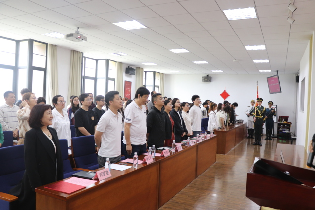 由八一社国旗护卫队参与接送国旗,体出席人员面向国旗,以饱满的精神状态奏唱“中华人民共和国国歌”