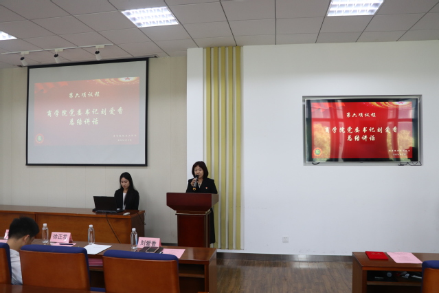 刘爱香书记对商学院征兵工作站的建成表示热烈祝贺,她代表学院衷心的感谢学校一直以来对学院征兵工作的支持和帮助,感谢多年来协助学院完成各项征兵工作的老师和同学,并对出席的校武装部领导和全体工作人员表示衷心的感谢。她表示商学院征兵工作站的成立标志着我院征兵工作将迈向新的征程,她提出了三点希望:第一,希望商学院征兵工作站以此为契机,充分发挥学校、学院资源优势,加强与校武装部、学生处的联动,做好征兵宣传工作和学生的思想政治工作,引导更多品德兼优的学生投身军营、参与建功强军事业。第二是严格落实退役军人优待政策,要充分保障退役学生在转专业、国家助学金、学费减免、学费补偿、评奖评优、就业帮扶等方面的权益。第三是持续完善征兵工作站的建设,提升服务工作的内涵,全力打造功能齐全、服务周到、暖心温馨的标杆式征兵工作站,不断提升应征入伍学生、在校退役学生的荣誉感、幸福感、归属感和满意度。