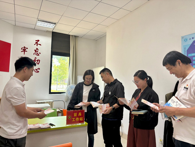 牌仪式结束后,上海建桥学院武装部部长张巍一行实地参观了学院征兵工作站,详细了解了工作站建设情况,为了更好地提高商学院意愿参军学生的问询服务水平,商学院一站式服务中心摆放了初检设施,如视力表、身高体重测量器等,方便来访者自检自测。同时还摆放了“2024征兵宣传手册”等供来访者取阅。