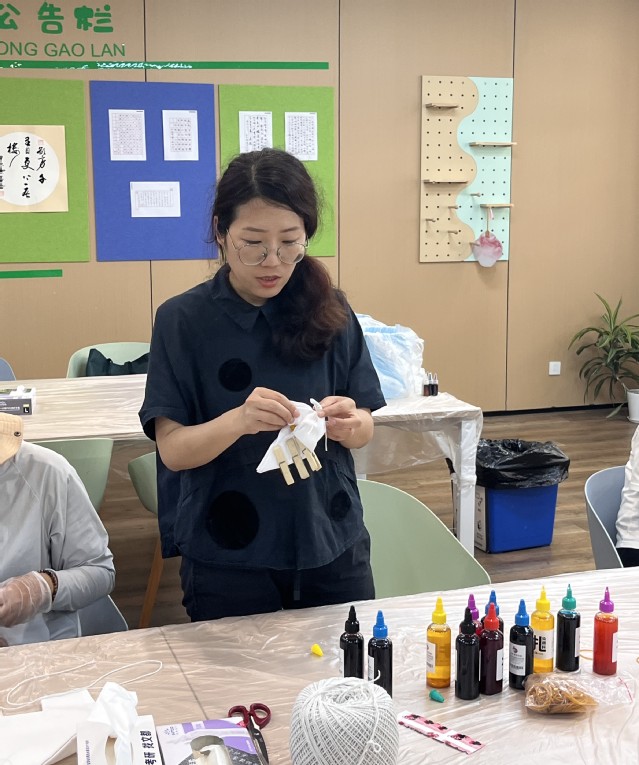活动伊始,刘晓老师就扎染技术进行讲解,教授学生如何制作扎染作品。通过叠、绑、染……小小的方巾在不同的扎染手法下呈现出了独具一格的图案,制作出了一件件各具特色的扎染作品。随后,在活动现场,以漆做笔,以水做画,带领学生体验漆扇魅力,利用水的流动性,将大漆印于扇上,制作一份份独一无二的漆扇。