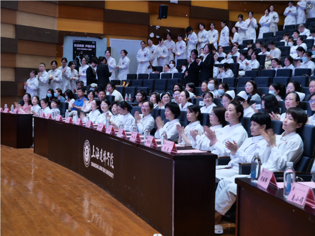 仪式上,来自复旦大学附属金山医院、上海市同济医院、上海东方医院、上海中医药大学附属曙光医院等各大医院的护理部主任及主任的特别代表为护理专业的317位同学授帽,戴上洁白而庄严的燕尾帽,寓意着他们正式踏上了职业护士之路,承担起守护生命的神圣职责。上海交通大学医学院附属瑞金医院护理部主任、主任护师朱唯一老师为同学们一一点燃象征“燃烧自己,照亮他人”的蜡烛。同学们在护理系黄海英老师的带领下,进行了庄严宣誓,坚守信念,终身纯洁,以南丁格尔精神为指引,忠贞职守,不忘初心。