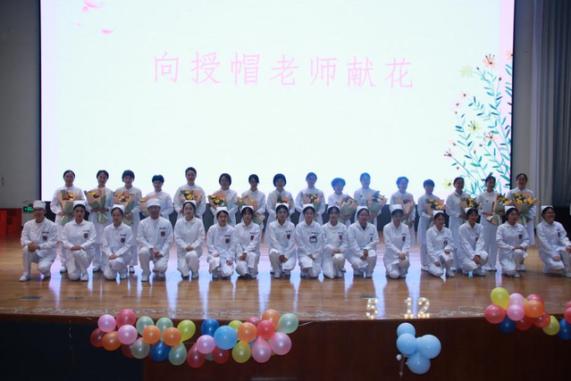 仪式中,为表达对各大医院护理部老师们的崇高敬意,感谢他们不辞辛苦前来我校,同学们也上台为全体授帽老师敬献鲜花。鲜花与掌声交织,凝聚着老师们同学们对护理事业无尽的敬意与热爱。