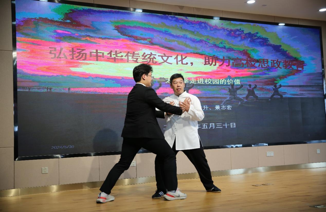 上海陈宗太极馆翟庆升馆长讲授了太极拳源远流长的历史,解析了其承载的传统文化的丰富内涵,并用深厚的武术功底,精彩演绎了陈式太极拳刚柔相济、快慢相间、松活弹抖、缠绕折叠、连绵不断的运动风格,精彩的表演赢得了阵阵掌声。翟馆长表示,通过练习太极拳可以帮助学生调节情绪,增强应对挑战和困难的能力,提升身心健康水平。