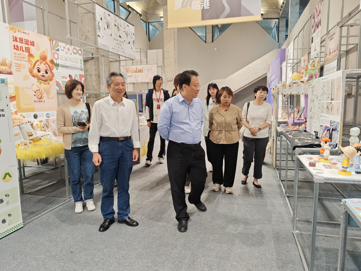 参观毕展期间,汤美娜副院长介绍了2024届“我爱临”毕业设计展学生优秀作品、学院专业设置、人才培养和近年来毕业生就业等情况。杨书记参观了视觉传达设计、环境设计、数字媒体艺术、艺术与科技专业的优秀毕业设计作品及“临港主题”设计展台,不时提出相关问题,听取学院教师的介绍,认真了解作品的创作主题、创作背景、文化内涵和作品的市场应用情况,对学生的作品给予高度评价,对学生和指导老师付出的辛勤劳动给予高度赞赏,并指出艺术设计类专业发展要坚持产教融合,要切实提高学生的实践能力和创新创业能力,把课程内容对接职业标准、教学过程对接生产过程;要加强政校企合作,主动与地方政府、市场和企业对接,做到立足临港、依靠临港、服务临港,并汇聚各方力量推进人才培养工作高质量发展;要鼓励学生敢于走出去,与行业和市场进行接轨,促进设计成果转化,推进创业就业,不断完善我校艺术设计应用型人才培养体系;希望艺术设计学院充分发挥专业优势,在国家级非遗文化传承与材料创新,以及校园文化、品牌建设中发挥更大的作用。