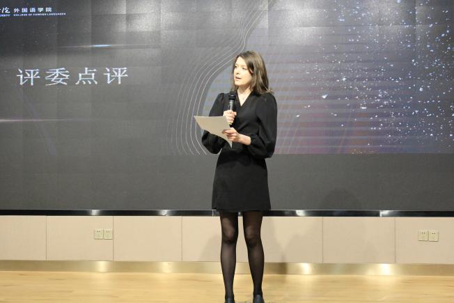 赛后,外教Anna代表评审团对选手表现做点评发言。Anna评委首先对选手们的表现给予了高度评价,认可选手优秀的语言能力,认为选手们对主题的理解独特,在语言表达、逻辑思维以及情感传递等方面都表现得十分出色,指出选手们在舞台上的自信与风采令人赞叹。此外,Anna还提到,英语演讲所需要的不仅仅是语言能力,更要求开阔的视野和创新的思维。评委的点评深刻且专业,极具启发性,参赛选手和在场观赛学生都获益良多。