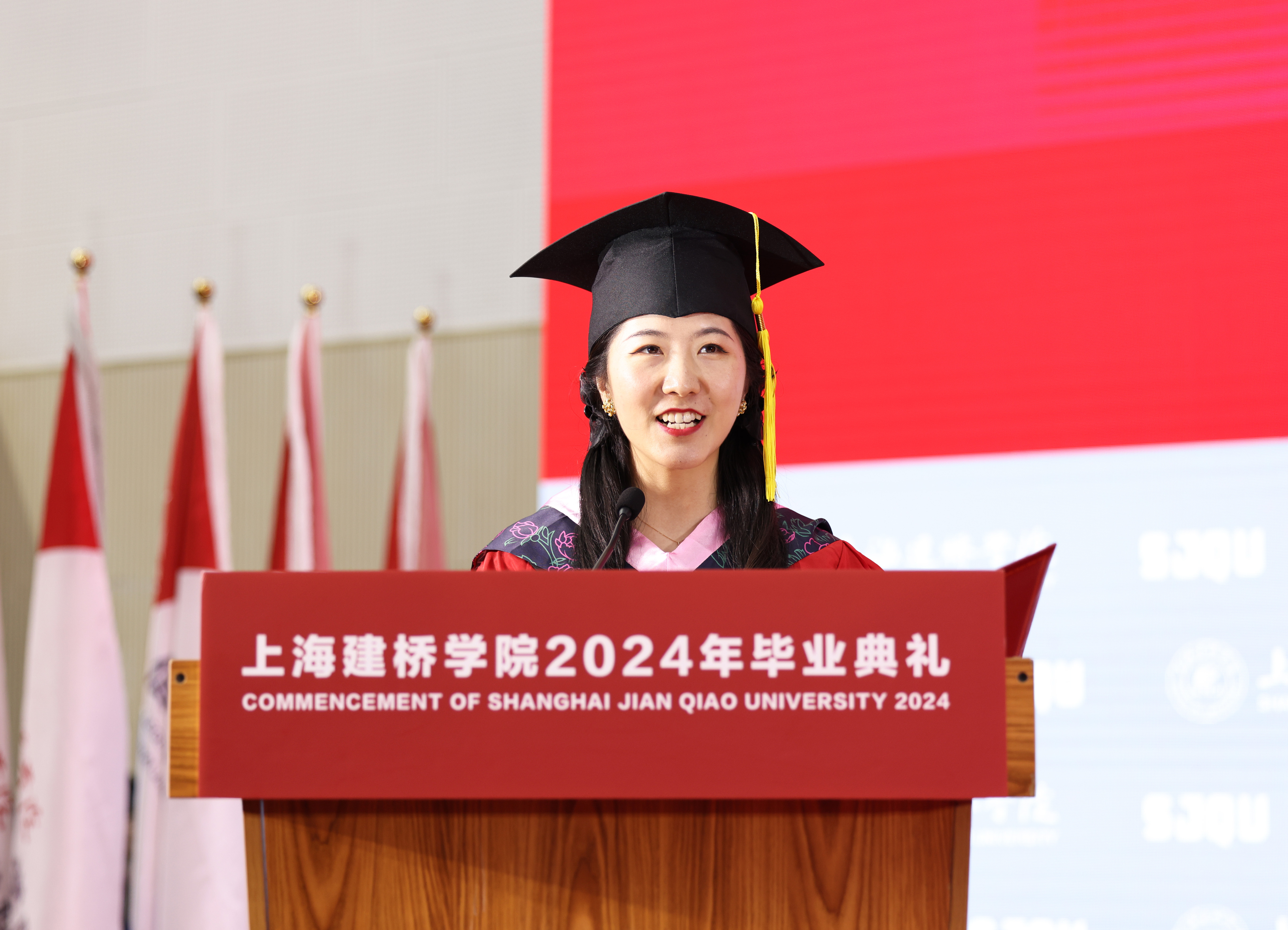 毕业生代表、新闻传播学院滕菲发言,回首四年的大学生活,表示在“建桥”学会了独立、奉献、锐意进取、勇往直前等优秀品质,感谢老师们的悉心培养,祝福母校蓬勃发展,明天更美好。