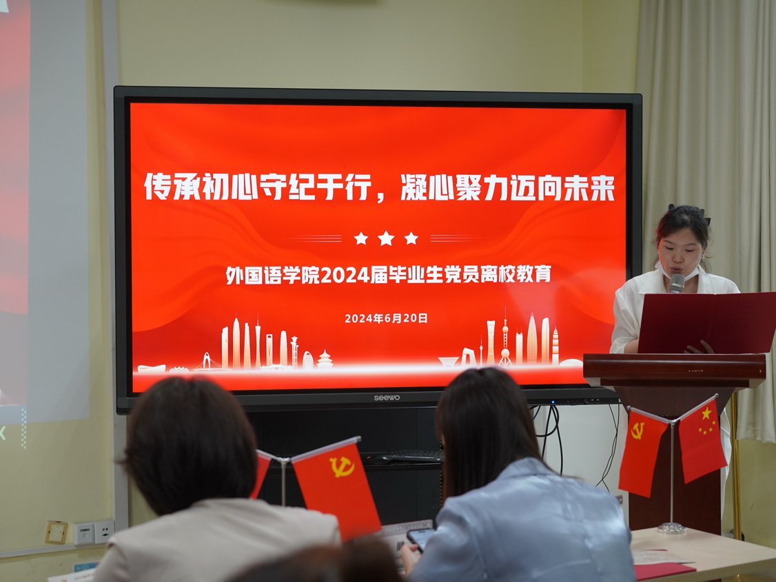 为推动党纪学习教育走深走实,教育引导全体毕业生党员坚持不懈用习近平新时代中国特色社会主义思想武装头脑,自觉增强“四个意识”、坚定“四个自信”、做到“两个维护”,强化遵守纪律的政治自觉、思想自觉和行动自觉,2024年6月20日,外国语学院举办了以“传承初心守纪于心,凝心聚力迈向未来”为主题的2024届毕业生党员校教育活动。出席本次活动有外国语学院党委书记杜鹃、党委副书记伊莉、第一学生党支部书记赵磊、第二学生党支部书记方毓锦,第三学生党支部书记吴多发、毕业班辅导员,活动由党委组织员刘沛雨主持。
