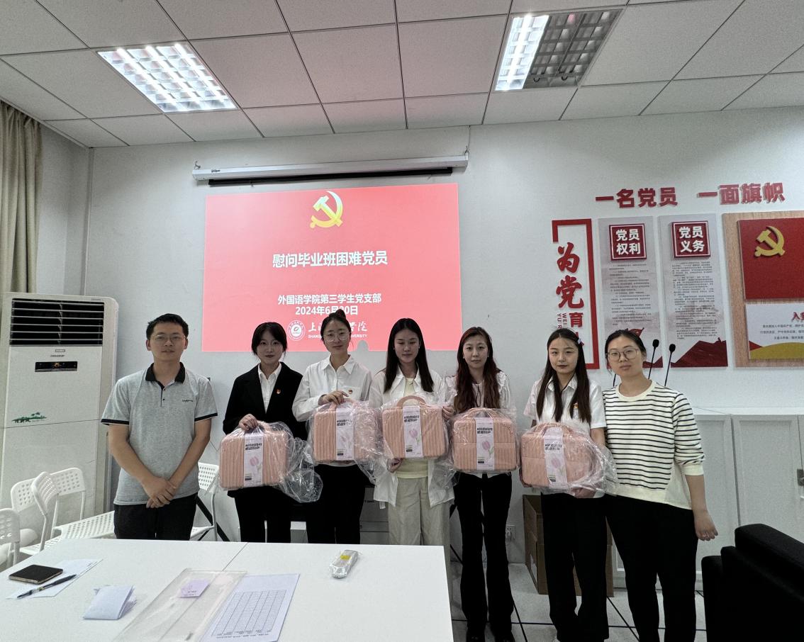 活动最后,各学生党支部书记慰问了困难毕业生党员,详细询问了同学们的工作落实情况和离校手续准备情况等,希望同学们在走向社会后不要忘记母校和老师们的教导,在各自工作岗位踏踏实实、认认真真,继续为社会发光发热。此外,各学生党支部书记还送上了给困难毕业生党员的礼物,代表学校和学院表达对困难党员的关爱和照顾,学生也表示将不辜负学校和老师们期望,今后在工作岗位中继续发挥党员先锋模范作用,以优异成就回报组织的关怀。