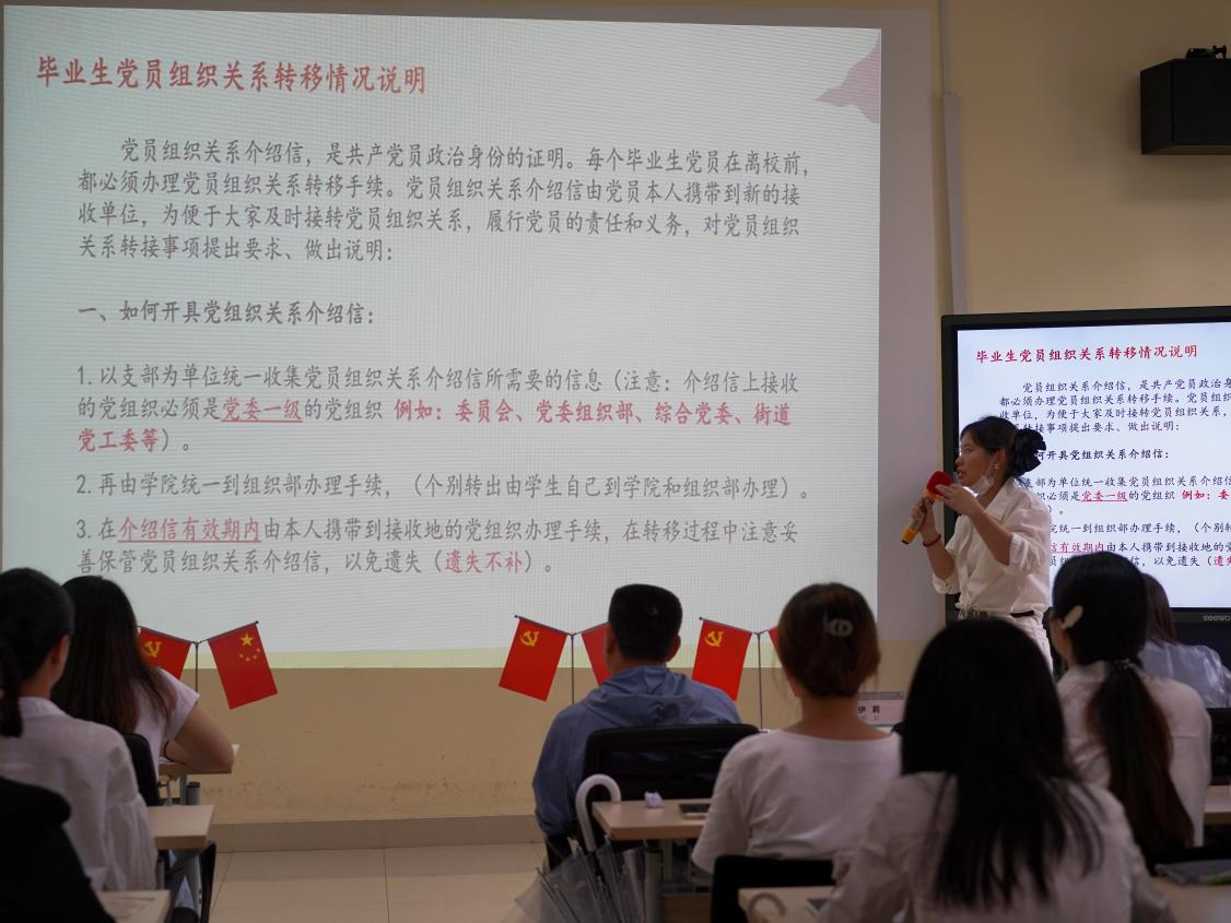 为确保毕业生党员能够顺利地进行组织关系转接,党委组织员刘沛雨老师从党员组织关系介绍信概念、转接流程、转接去向等方面,向毕业生党员进行了党组织关系转接情况说明,详细讲解具体过程并现场答疑解惑。
