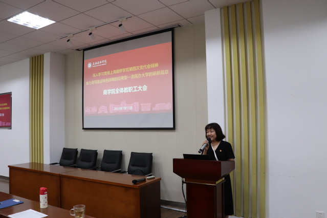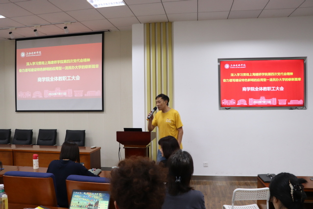 为深入学习贯彻上海建桥学院第四次党代会精神,奋力谱写建设特色鲜明的应用型一流民办大学的崭新篇章。7月11日上午,商学院组织召开全体教职工大会,大会由高健院长主持。本次大会共分为三个议程:一是新教师介绍,二是刘爱香书记介绍学校第四次党代会精神及标杆院系创建工作,三是尹卫华副院长介绍迎接本科评估相关工作安排和要求。
