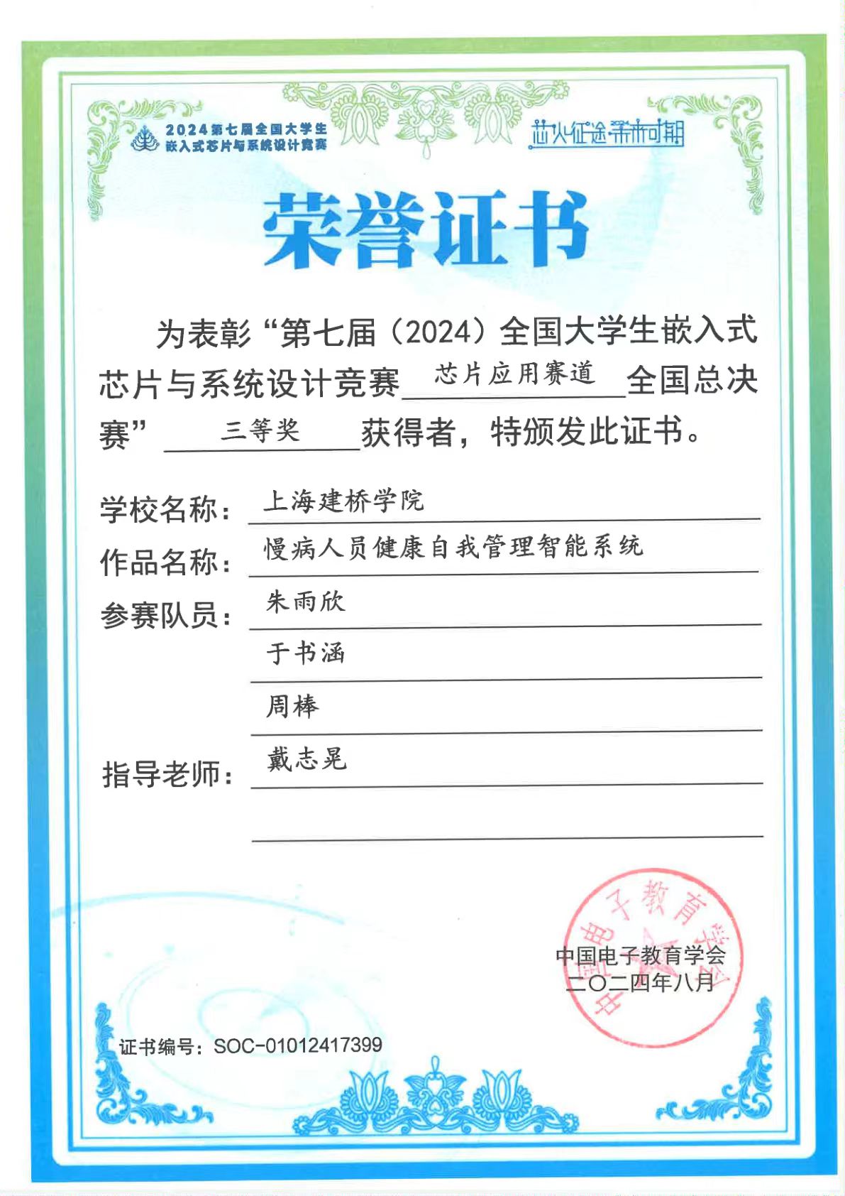 8月11日,第七届全国大学生嵌入式芯片与系统设计竞赛应用赛道大赛全国总决赛在南京圆满落幕,我校信息技术学院朱雨欣、周棒、杜宇航和于书涵组成的团队(指导老师:戴志晃)荣获全国三等奖。