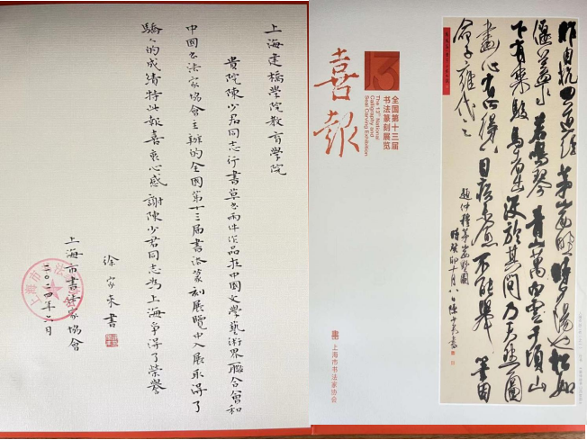 教育学院陈少君老师在四年一届的全国十三届书法篆刻大展中荣获草书、行书两体入展的优秀成绩。该比赛是中国文联、中国书法家协会主办的高规格大赛,被称为书法届的“奥林匹克”。此次,陈少君老师不仅受到所在行业协会—上海市书法家协会的荣誉表彰,还获得协会两万元的创作奖励基金,是对其业务能力的充分肯定。