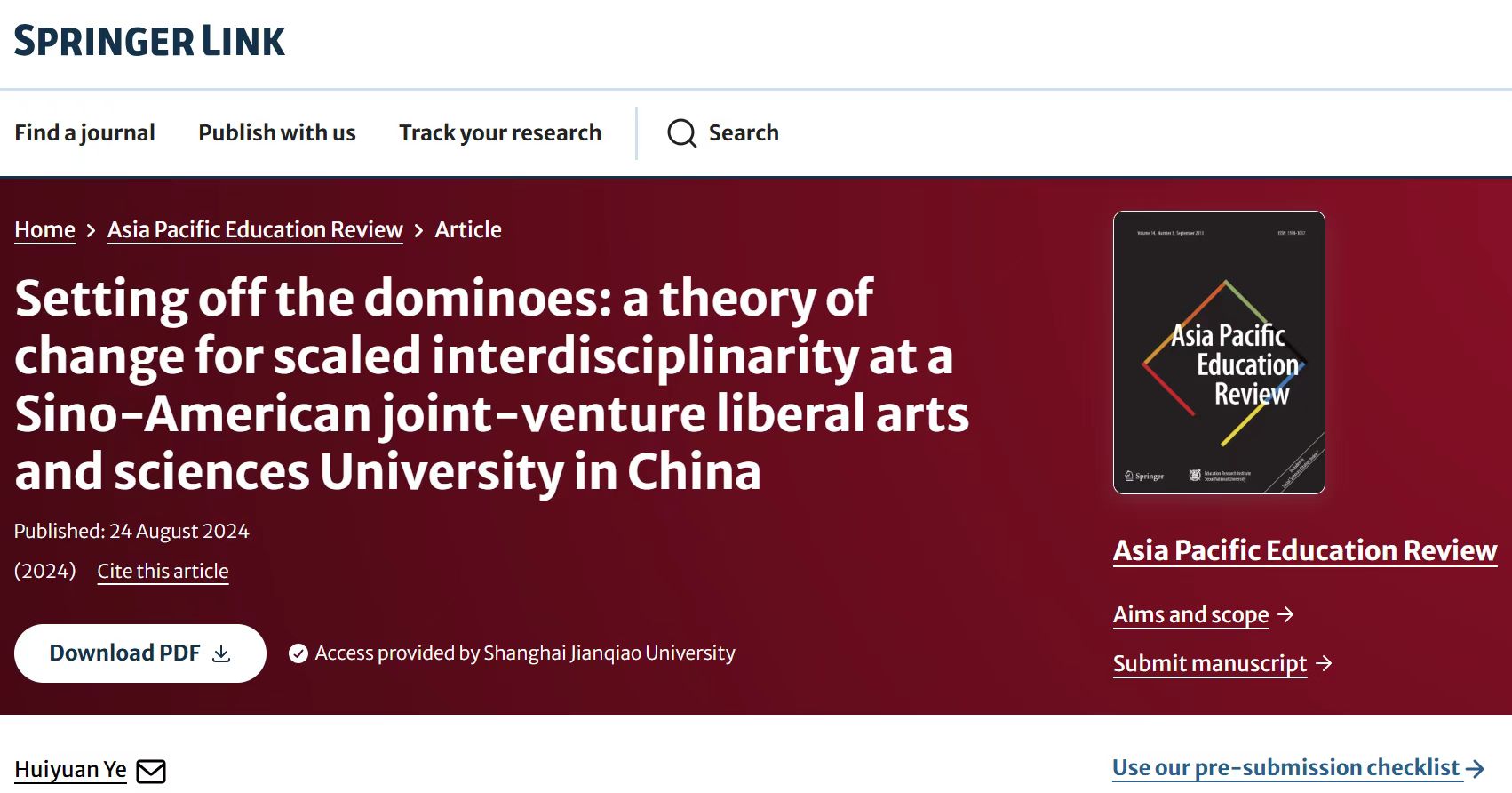 近日,外国语学院科研团队负责人兼英语系专任教师叶会元博士在SSCI核心JCR一区期刊《亚太教育评论》(Asia Pacific Education Review)上发表题为“推倒多米诺 — 本科教育中的流动性跨学科理论实证再探”的学术论文。该期刊在基本科学指标数据库(Essential Science Indicators,简称ESI)的22个学科中隶属“一般社会科学”分类。