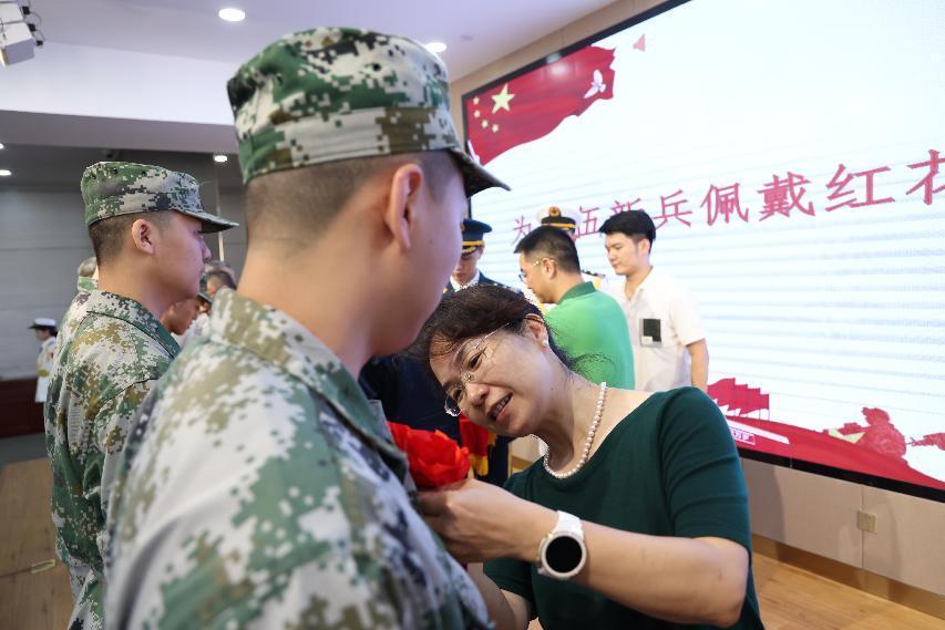 领导们为全体预定新兵佩戴大红花、赠送纪念品,并合影留念。入伍新兵代表李达翔同学代表全体新兵发言,他表示参军入伍是崇高的使命、无私的奉献,将牢记入伍誓言,铭记使命担当。外国语学院征兵站站长赵磊老师作为教师代表发言,忆往昔峥嵘岁月,看今朝新兵入伍,他希望同学们不要害怕困难,不要逃避挑战,勇敢地面对它们,不断总结经验、努力超越自我。