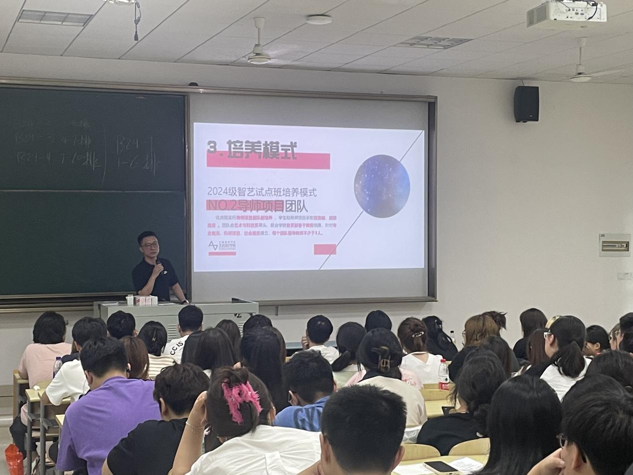 本次选拔工作由艺术与科技系高一方主任组织策划,针对艺术与科技系、视觉传达设计系和数字媒体艺术系的24级新生展开宣讲。宣讲环节中,徐行老师详细介绍了智艺试点班的成立背景、教育理念、培养模式及选拔流程,特别强调了试点班在硬件设施和师资力量方面的显著优势,这为试点班学生未来在校期间取得优异成绩和标志性成果提供了有力保障。此外,针对学生们关心的专业选择、课程安排、选拔标准以及就业升学等问题,徐教师也进行了耐心细致的解答,极大地增强了同学们的信心与积极性。通过线下宣讲和线上咨询相结合的方式,选拔测试吸引了129名新生踊跃报名,竞争激烈。
