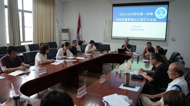 9月19日上午,信息技术学院在205会议室召开2024-2025学年第一学期质量管理办公室扩大会议。校级督导袁仲雄教授受邀出席,学院领导、各系主任、质量管理办公室督导成员参加会议。会议由质量管理办公室主任赵正德教授主持并汇报工作。