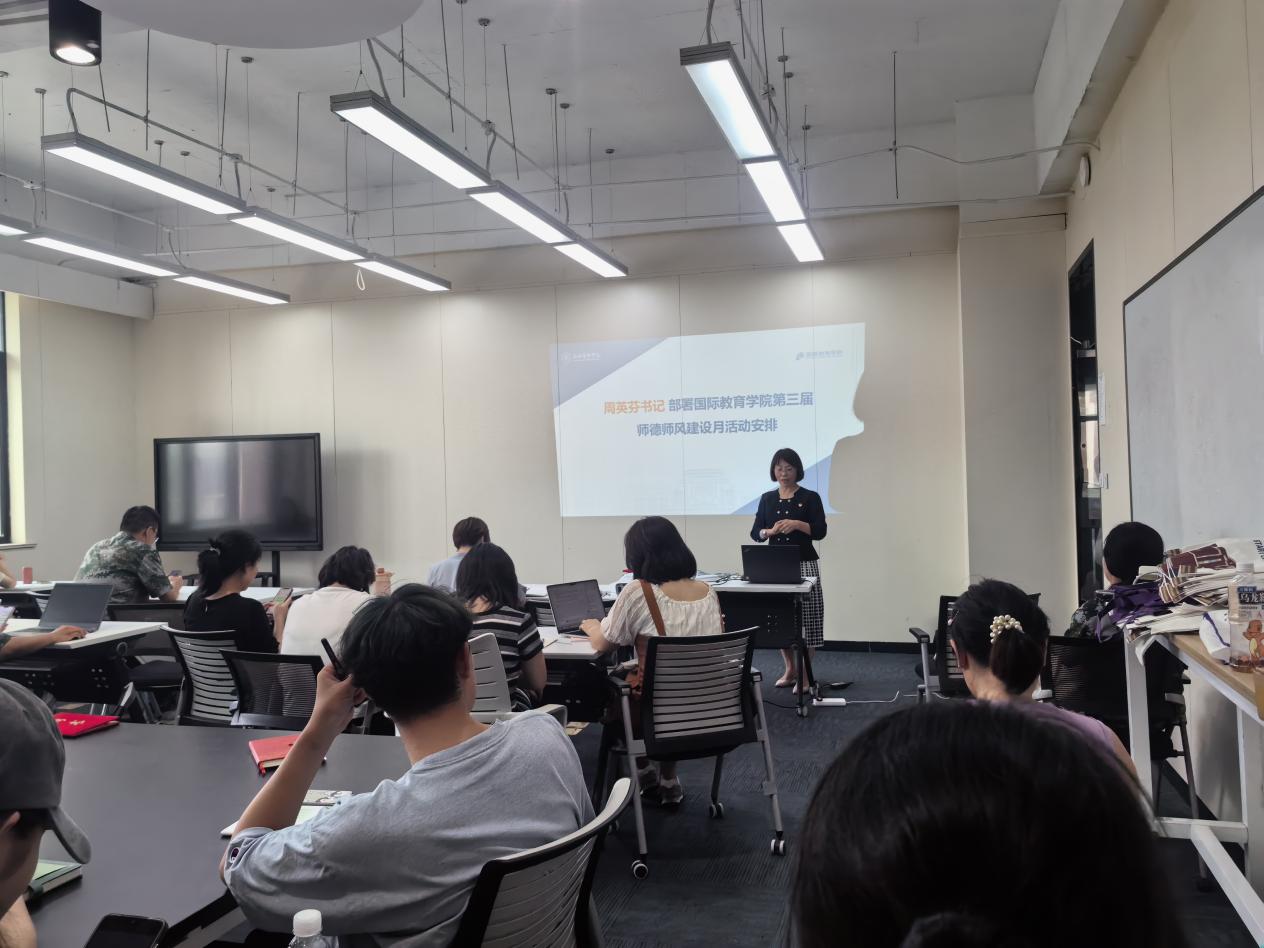 2024年9月19日下午,国际教育学院在学院四楼会议室召开“大力弘扬教育家精神,加快建设教育强国”教师思想政治和师德师风建设月动员大会,会议由学院党总支书记周英芬主持,学院全体教职工参加会议。