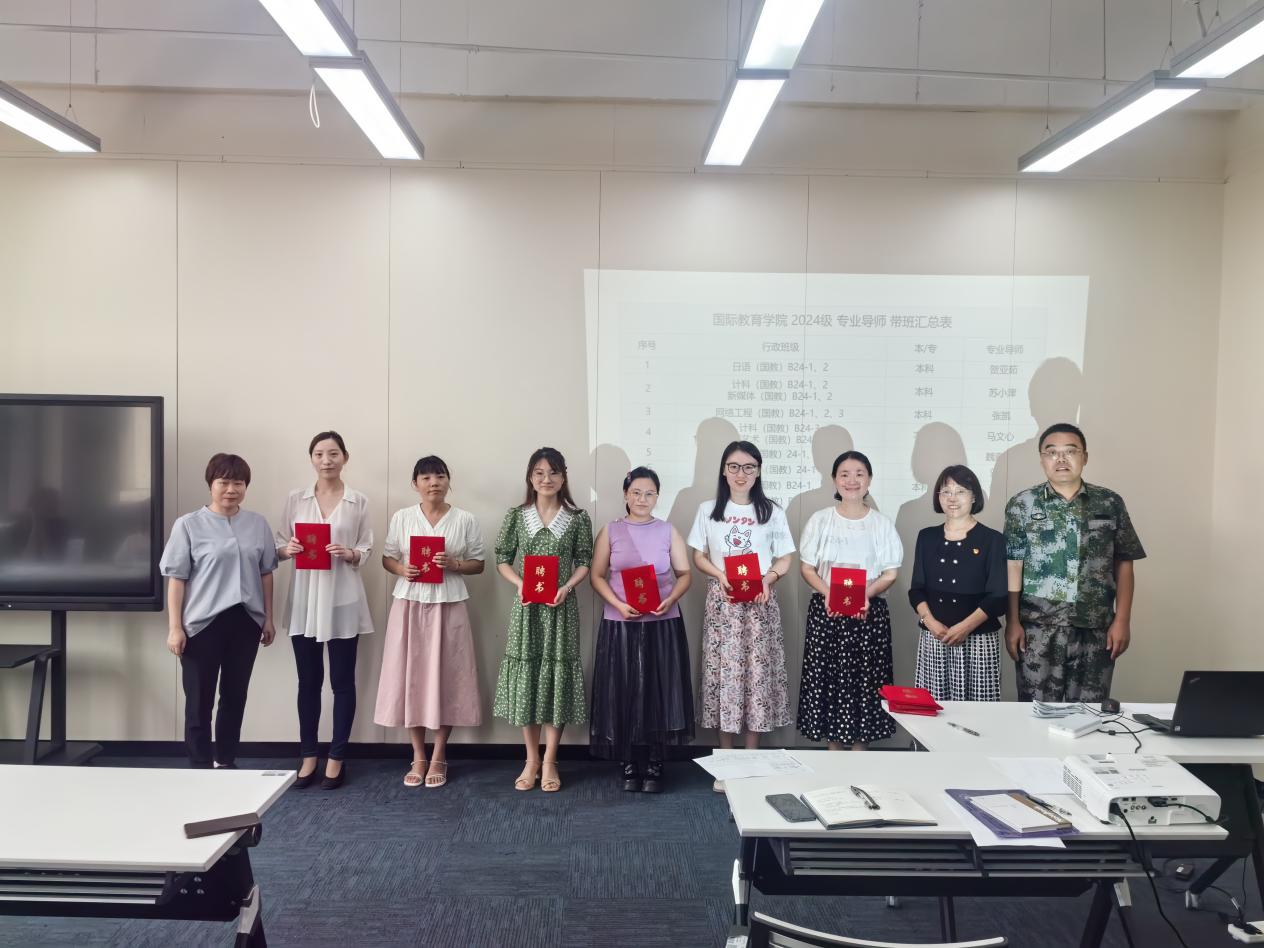 会上举行学院2024级专业导师聘任仪式,由周英芬书记、刘潇滢院长和徐伟副书记为贺亚茹、苏小津、马文心、张凯、魏嘉敏、刘莹等9位2024级专业导师颁发聘书。