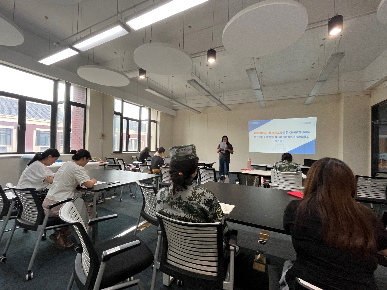 党总支纪检委员、日语教学中心主任杨晓兴为学院新进教师领学《新时代高校教师职业行为十项准则》和《教师师德失范行为处理实施办法》,确保每位教师知规范,明底线。