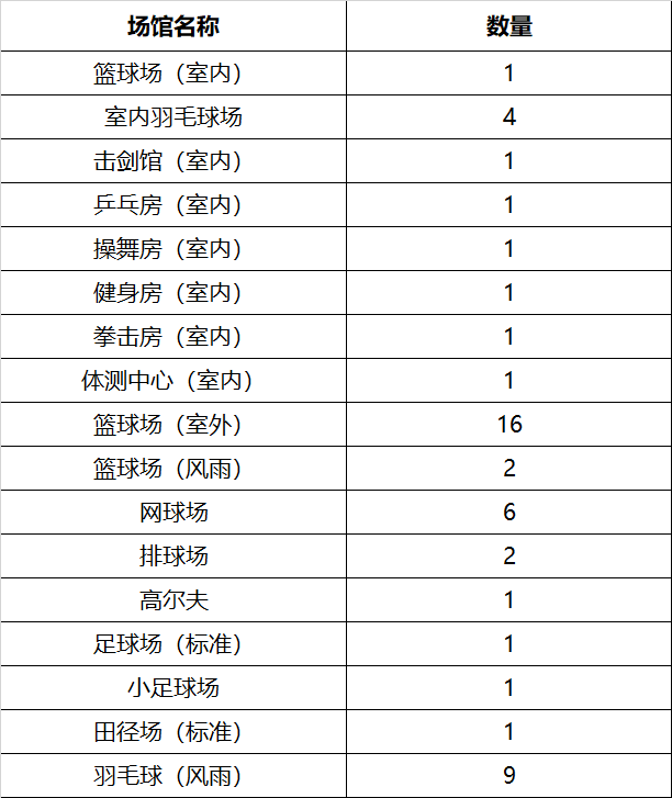 室外场地包括含有标准塑胶跑道、大足球场和观众看台的田径场一座,网球场6片,排球场2片,高尔夫练习场1片,小足球场1片,风雨篮球场2片,篮球场16片。