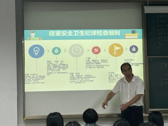为进一步规范学生的日常社区管理,营造干净整洁的宿舍卫生和个人卫生环境,提高学生安全防范意识,及时排查宿舍安全隐患,创造良好的平安校园环境,确保师生安全及校园稳定提高学生的自我管理能力,培养学生良好的生活习惯,从9月21日晚自习开始商学院社区负责人陈传宝老师开启了为期两周的关于学生宿舍卫生和安全得进班宣讲,为大一新生详细讲解了社区安全的重要性和“三级建家”的实施办法。