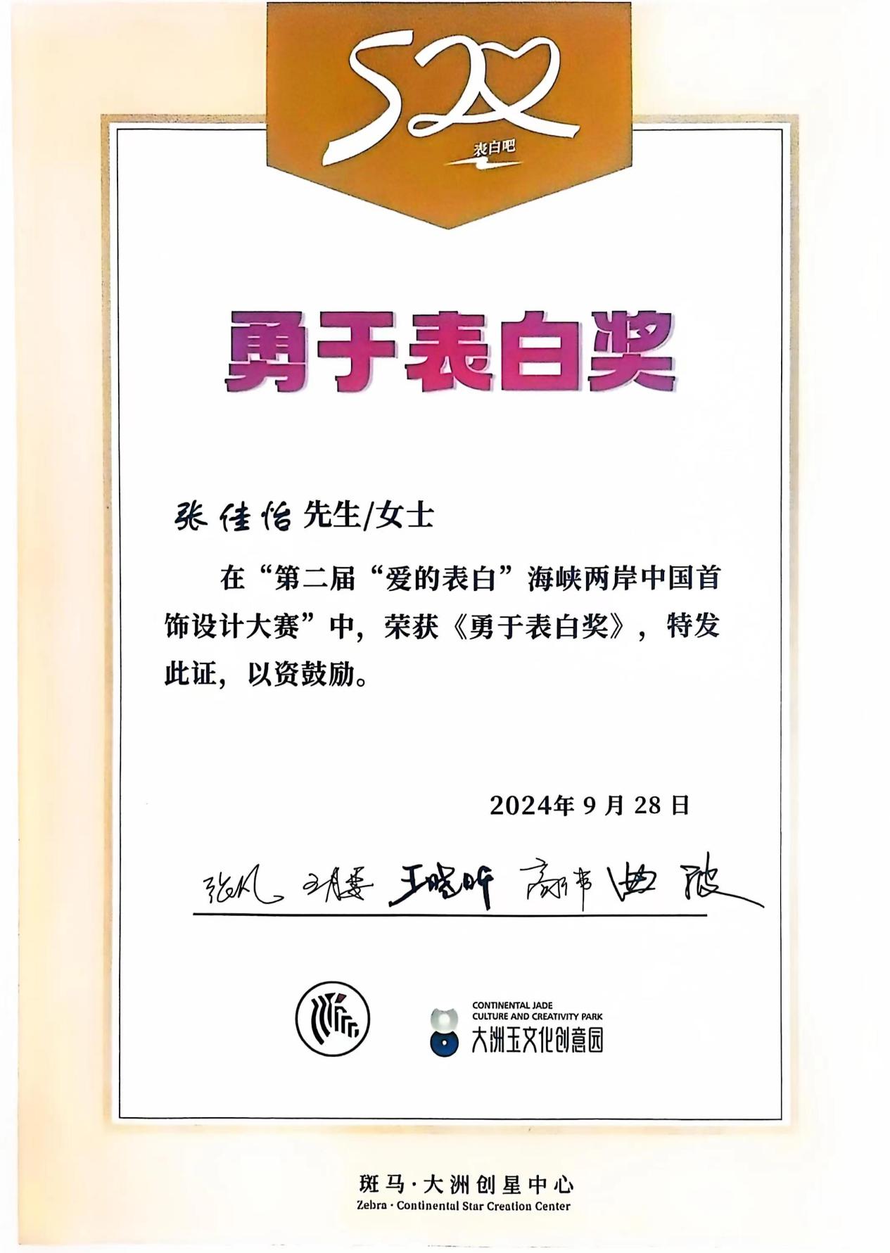 本届海峡两岸中国首饰设计大赛吸引了众多参赛者,参赛作品近300件,从中评选出15位获奖者。我校珠宝学院表现突出,3名学生荣获“勇于表白奖”,分别是产品设计22级1班郑贝蒂的《银唯有你,三生有杏》、22级3班张佳怡的《卺缘情深》以及21级4班徐慧颖的《花朝月夕》。