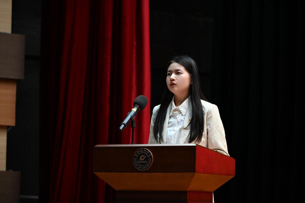 郑越老师代表新生辅导员进行发言。她表示自己选择成为教师,选择成为辅导员,充满了对学生的热爱和责任,正如陶行知先生所说:“捧着一颗心来,不带半根草去。”在学院领导的关爱、同事的帮助以及学生们的期待下,郑老师深刻体会到了国教大家庭的温暖和力量。