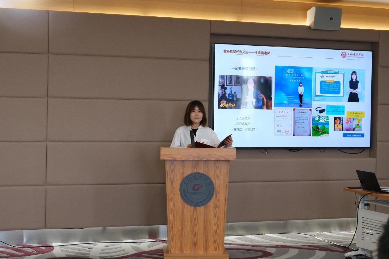 艺术与科技专业的党员代表牛向南结合自己的教学竞赛经历,认为教学需始终学习,在竞赛中磨砺,在竞赛中学习,在实践中成长,在实践中创新,一步步改变自己的教学方法,以思政为引领,以项目为动线,以艺术为中心,以科技为核心,引入时下的新话题、新科技、新时尚元素,从“项目”出发,引导学生结合项目进行设计方案的模拟实操,真正做到学以致用。牛老师表示将继续秉持着“立德树人”的教育初心,坚守“以学生为本”的教学理念,为学生提供更多接触前沿科技和艺术实践的机会,帮助他们在专业领域内实现自我价值和社会价值的双重提升。