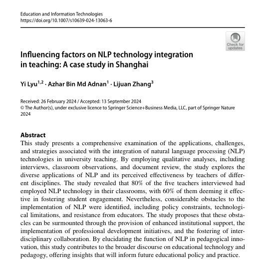 新闻传播学院网络与新媒体系老师吕益和外国语学院英语系教师张丽娟教授在SSCI核心JCR一区杂志《教育和信息技术》(Education and Information Technologies)上发表“基于NLP 技术融入教学的影响因素研究”(Influencing Factors on NLP Technology Integration in Teaching : A Case Study in Shanghai)的学术论文。该期刊在基本科学指标数据库(Essential Science Indicators,简称ESI)的22个学科中隶属社会科学(Social Sciences, General)分类。