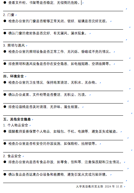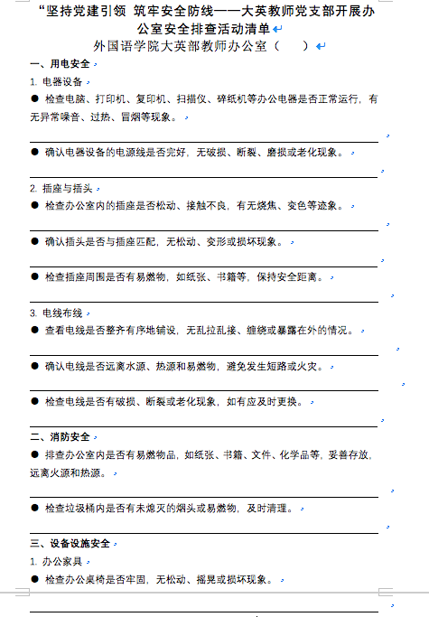 活动伊始,支部副书记傅荣琳先组织党员教师们在外国语学院410开展办公室安全排查工作部署会。傅荣琳强调,通过全面、细致的安全排查,及时发现并消除办公室内存在的安全隐患,确保办公室的安全稳定,为教学工作的顺利开展提供有力保障。紧接着,在党支部的精心组织下,党员教师们根据《坚持党建引领 筑牢安全防线——大英教师党支部开展办公室安全排查活动清单》迅速行动起来,对大英部教师各个办公室进行了全面细致的安全排查。他们认真检查电器设备是否正常运行,电线是否存在老化、破损等安全隐患;同时,仔细查看办公桌椅、文件柜等设施是否牢固,有无损坏情况;此外,对消防器材也进行了严格检查,确保在紧急情况下能够发挥应有的作用。