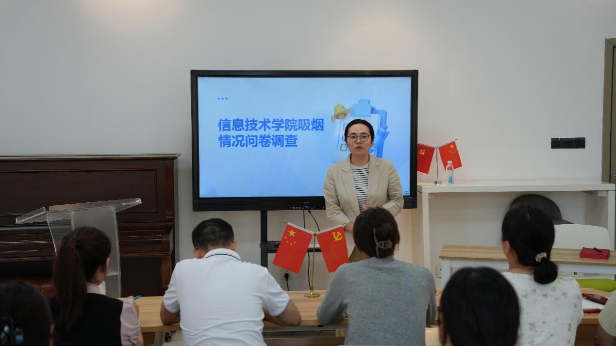 会上,负责学院学生社区管理横向工作的辅导员濮春婷老师详细解读了“信息技术学院学生吸烟状况的问卷调查”数据,对调研发现的问题进行了警示,对下一步控烟禁烟工作开展提出了建议。