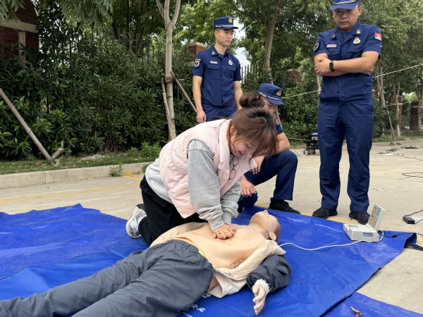 消防员们以专业而严谨的态度,向师生们详细讲解了逃生的正确姿势、各类消防器材的正确使用方法、心肺复苏的正确姿势、厨房安全用火等多个应急技能,包括灭火器的启动、喷射,以及消防栓的快速连接和操作等,详细的演示了各项技能的操作步骤。通过讲解,师生们积极参与模拟演练,认真进行了灭火器的使用练习、心肺复苏等实际操作,以确保在紧急情况下能够迅速而准确地进行急救。