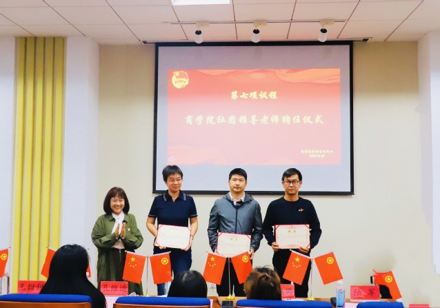 最后,院党委书记刘爱香副教授与院党委副书记俞海燕老师为商学院社团指导老师授予聘任证书,院分团委书记马璐璐老师与院社团负责老师孔维迪老师为社长们颁发聘书。这意味着商学院社团工作将有了强有力的支持和引导,社团的发展也迎来了新阶段。