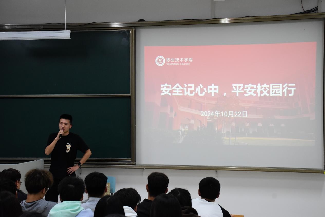 为了更好的提升学生们的安全意识,加强校园安全管理,10月22日晚,职业技术学院于举办了一场以“安全记心中,平安校园行”为主题的班会活动。活动邀请了杨浦区淞沪消防救援站战斗员徐良杰作为主讲。本次活动旨在通过宣传和培训,引起学生们对安全问题的关注和重视,提高应对突发事件的能力。