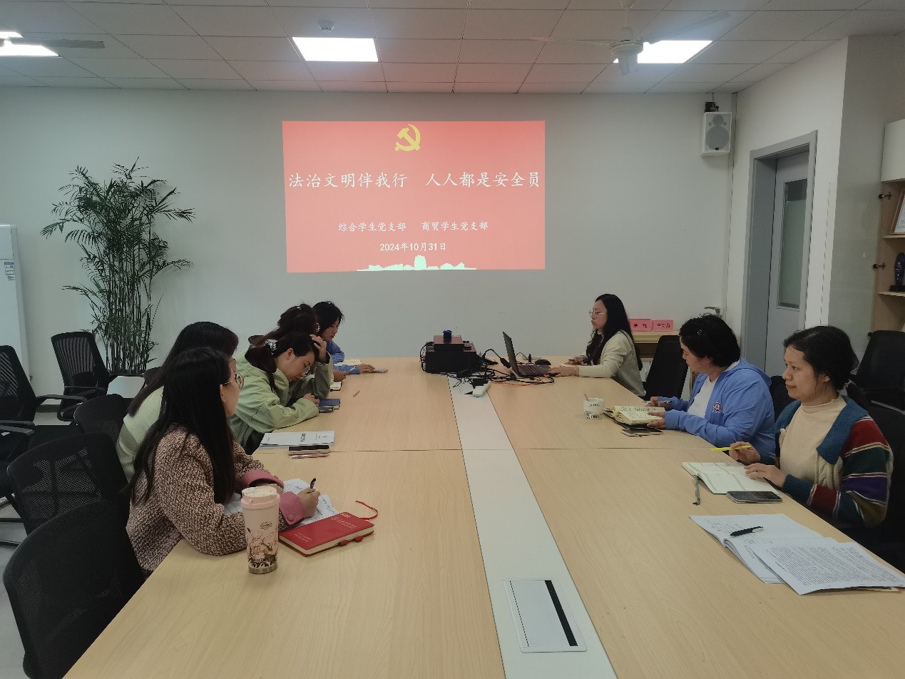 学院组织员廖艺晗首先传达关于学校安全教育宣传月文件精神,强调本次安全宣传月以习近平总书记关于总体国家安全观的重要论述为指导,推动树牢安全理念、筑牢安全防线,强化底线思维和红线意识,提高广大师生的安全意识和安全素养,提高在校学生应对安全事件的处理能力。其次,全体与会人员共同观看《消防安全案例警示片》,并结合学校实际工作进行讨论。最后,廖老师结合本次宣传月的活动主题,带领全体与会人员共同学习安全相关法律法规,并通过具体案例,“以案说法“,强调校园安全稳定的重要性。