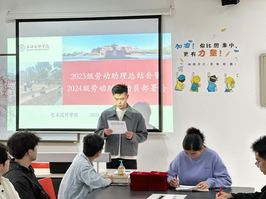 为深入推进学生劳动意识的培养,提高劳动教育水平,营造整洁、优美的校园环境。2024年10月24日在艺术设计学院实训楼219教室召开2023级劳动助理总结会暨2024级劳动助理动员会。出席会议的有劳动教育课负责老师、2023级劳动助理代表以及2024级全体劳动助理。