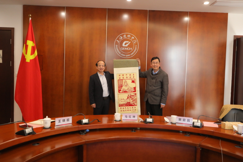 朱瑞庭对马红坤一行的到来表示欢迎。他从建校历程、专业建设、产教融合、人才培养及党政建设五个方面展开详细的介绍与探讨。朱校长表示,学校一直致力于构建德智体美劳全面培养的教育体系与高质量的应用型人才培养体系。他强调,未来学校将持续推进产教深度融合校企协同育人,并充分利用本校雷锋馆、国政馆、党建育人馆等红色场馆资源,持续打造“三馆育人”特色思政育人品牌,构建立体化思政育人体系。最后,他指出当下民办高校发展所面临的机遇与挑战,学校将不断加强治理体系和治理能力建设,推动党建与学校事业发展深度融合,以高质量党建引领学校高质量发展。