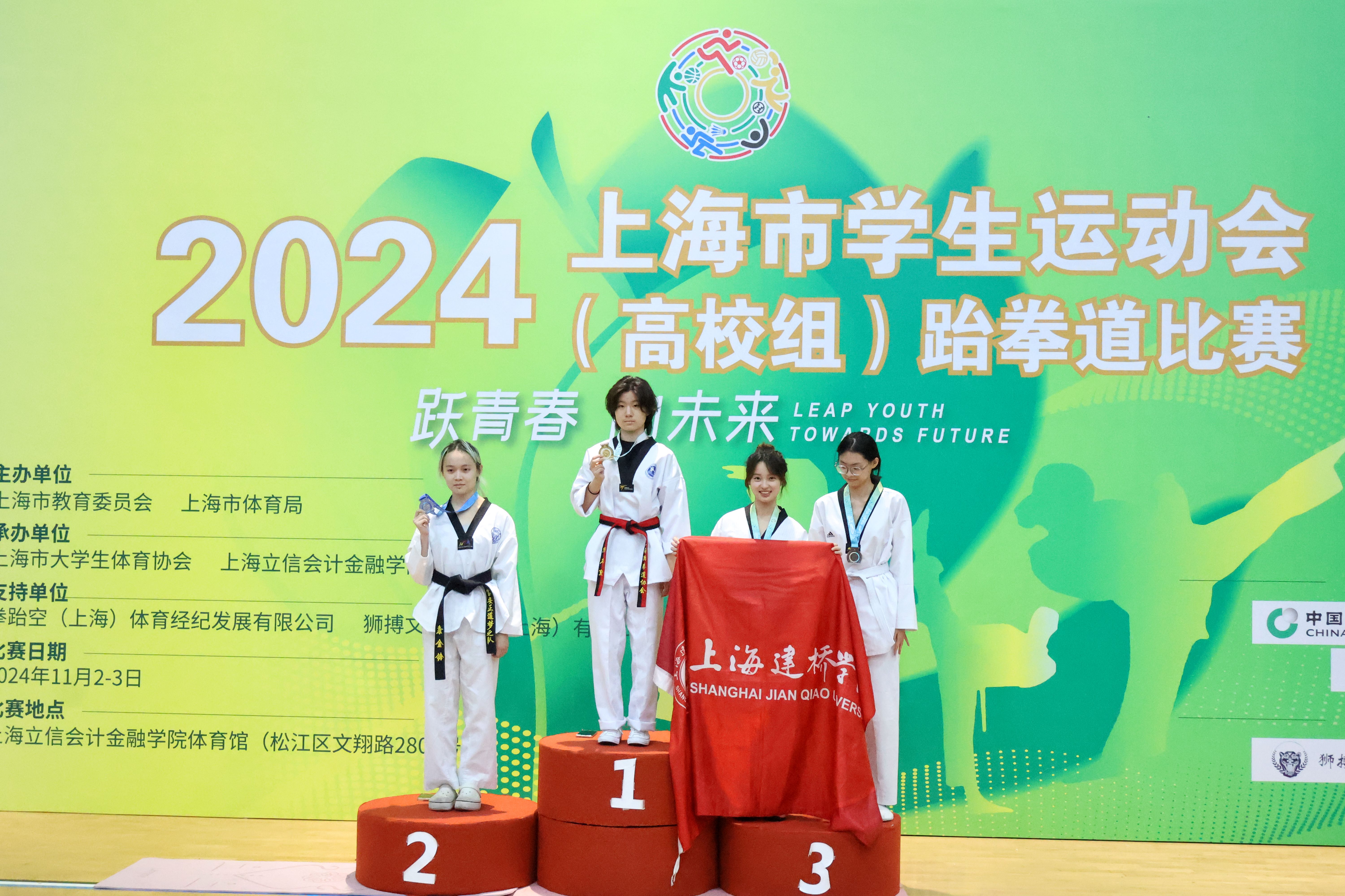 在此次比赛中,上海建桥学院跆拳道代表队展现出了出色的竞技水平和顽强的拼搏精神。代表队由体育教学部主任钟涛担任领队,丁浩老师则担任教练。在赛场上我校跆拳道队员奋力拼搏、不负众望,成功斩获了2金2银2铜的优异成绩。同时,在27个参赛代表队中,我校代表队凭借出色的整体表现,荣获团体总分第三名。