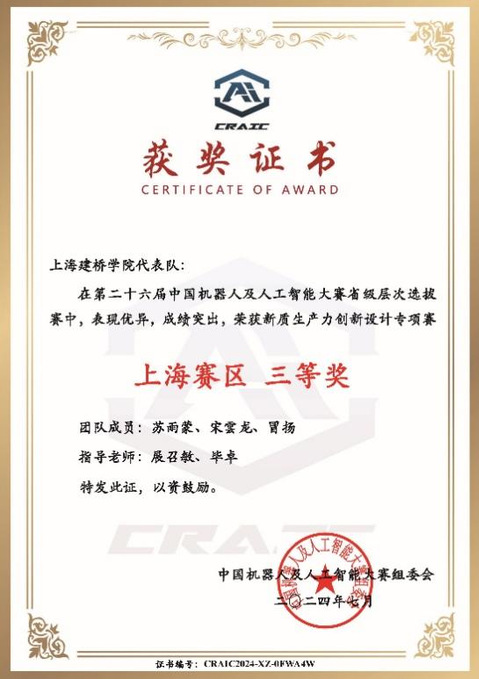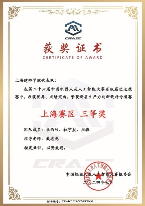 大赛从2024年5月到2024日7月进行,历时3个月,我院戴志晃、展召敏老师指导两支队伍参赛。经过了网上报名、作品制作、初评、评审等环节,现已顺利结束。经过评审委员的严格认真的评审,我院师生2组参赛队伍作品均荣获了上海市机器人及人工智能大赛三等奖的好成绩。