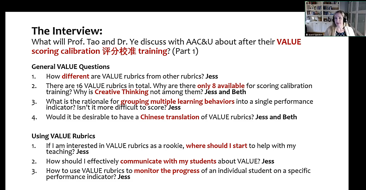 本期主讲人为美国高等院校协会(AAC&U)主管教学创新评估的Jessica Chittum博士(图二)。科研中心负责人叶会元博士首先介绍了讲座主题“大学生高阶能力评价量规VALUE”的基本情况(图一),随后与联合主持人陶然副教授一起对Chittum博士进行了专访。在晚间线上一小时的讲座和互动中,Chittum博士和外国语学院师生热烈交流,探讨外语类本科教育中的“高阶能力”和“真实性评价”两个主要议题。Chittum博士从一位教育心理学家和大学生高阶能力评估专家的视角出发,分析了VALUE这一评价量规的世界化发展趋势,强调了高阶技能评价在各国高等教育中日增的实证地位,并鼓励师生创造性地使用VALUE量规衔接教学和科研,提升自己。Chittum博士特别提到,VALUE量规虽是美国制造,但完善需要世界各国,尤其是来自中国的跨文化视角的贡献。
