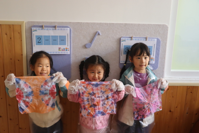 随后,志愿者们细心地为每一位孩子穿戴手套和围裙,做好扎染准备。刘晓老师进行扎染讲解,孩子们在志愿者带领下积极探索,亲自动手创作。他们用小手将染料浸透染布,制作出一幅幅独特且精美的图案,一布一型,一扎一染,皆是传承。