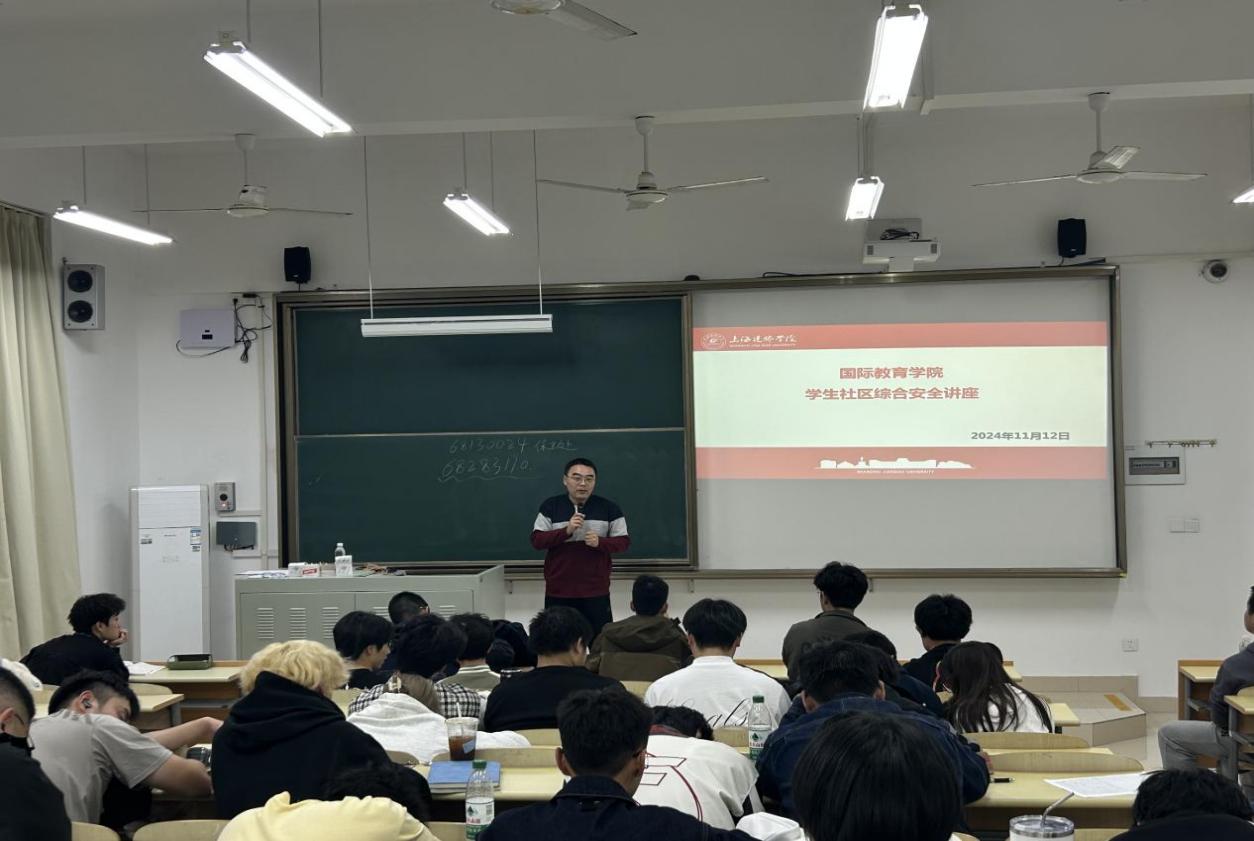 2024年11月12日晚,国际教育学院在二教召开学生社区综合安全讲座,本次讲座特邀后勤保卫处李祯老师为2024级学生开展安全教育,学院党总支副书记徐伟、后勤保卫处夏思老师及2024级全体辅导员参加。