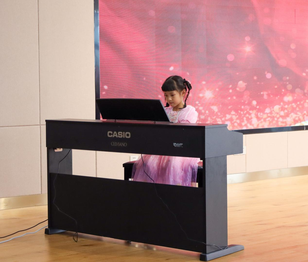 谢丹萍老师演唱《今天是你的生日》、谢丹萍和卞浩老师演唱《祝福祖国》,音乐老师高水平演唱让现场师生享受其中,脸上露出幸福的微笑。上海师范大学附属浦东临港科创小学分别表演了钢琴独奏《共产儿童团歌变奏曲》和诗朗诵《将进酒》,天真烂漫、生动情趣的表演把演出带向一个高潮,大家异口同声赞美孩子们的表演太可爱了,一口气背诵很长的诗歌,一点不怯场,真是未来可期啊。